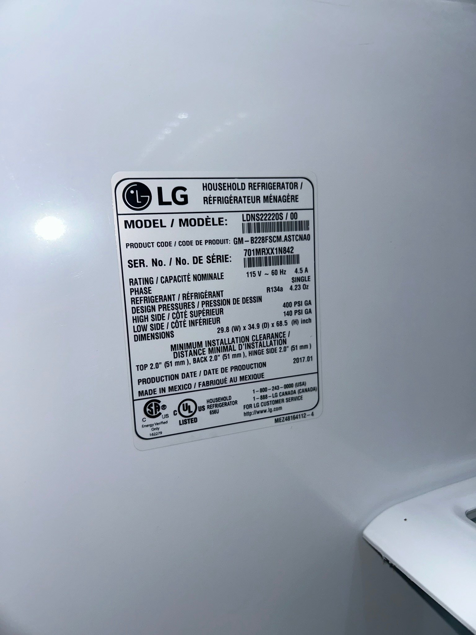 LG LG LNDS22220S Refrigerator Model – 22 Cu. Ft. Side-by-Side Fridge